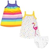 - One dress features a multi-colored dot print, flamingo applique and yellow trim; the other is decorated with rainbow stripes and purple trim